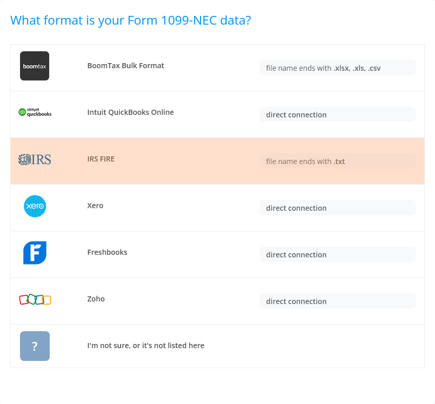 Select "Import from IRS FIRE File, QuickBooks Online, Xero & more..."