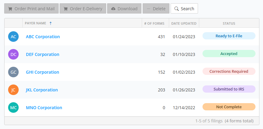 From here, you can see the date the filing was submitted, how many forms were sent, along with the IRS/SSA issued receipt id and the filing status.