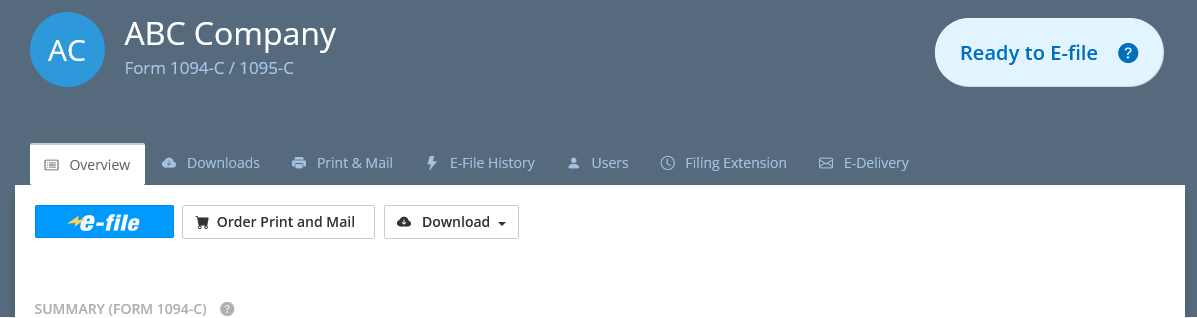 Once you have done this for all forms marked as 'Not Complete' (including the summary form), your filing will change to 'Ready to E-File' (as shown below).