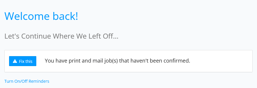 If you have an incomplete Print & Mail order, you'll see a reminder like this when you log in: