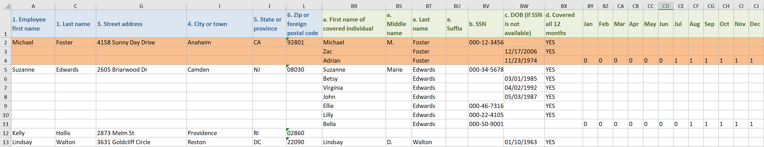 Looking at employee, Michael Foster (Line 2): this employee is listed as the first CI, then he has 2 other CIs listed below him. The employee data sections (column A-BQ) are left blank for the other CIs, as they are dependents of Michael.