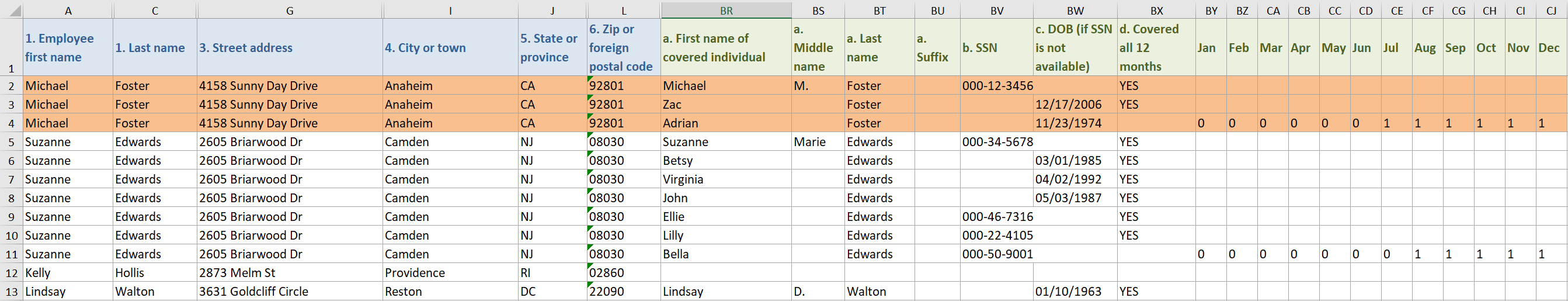 The covered individuals section of our ACA spreadsheet templates has green headers.