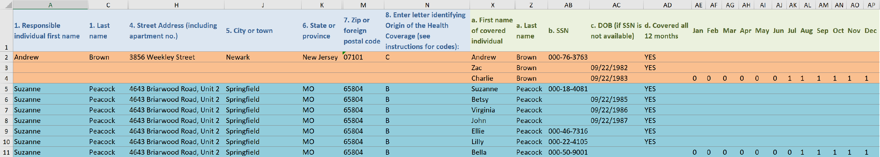 Any individuals that were covered for at least one month should be listed in the covered individuals' section (green column headers). This includes employees, spouses, and dependents who were enrolled in the offered coverage.
